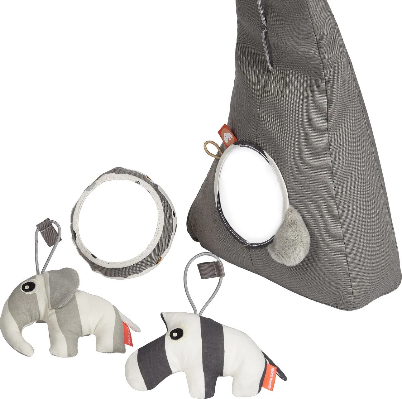 Cover: 50% cotton and 50% polyester. Filling: EVA foam, quartz sandbags. Toys with sounds and mirror included. Cleaning : wipe clean with soft damp cloth. Size: W45-80cm H40-48cm x 22cm.