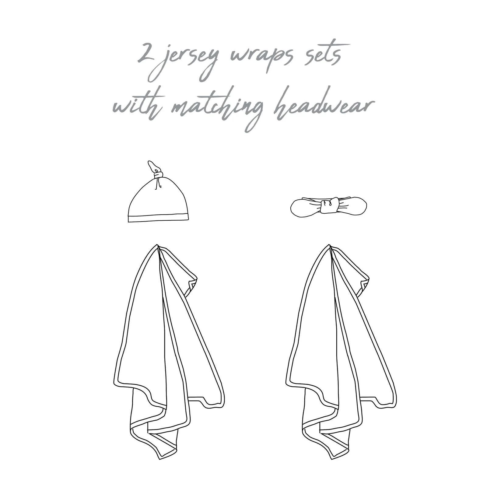 100% Cotton knit jersey wrap. It measures approx 100cm x 100cm. This wrap comes with a matching knotted beanie.