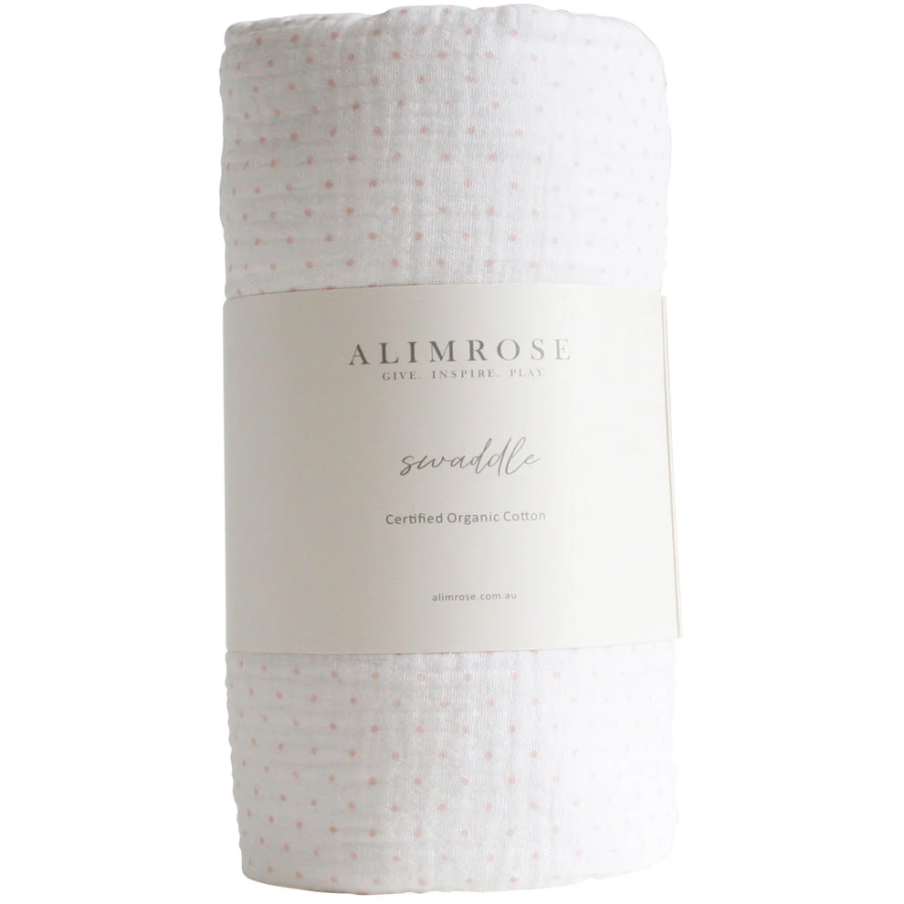 Alimrose beautiful swaddles are made with the softest organic cotton. They are generously sized to wrap your little one nice & snug. Always gentle on babies' skin, they will become softer with every wash! And they can easily be used for swaddling, shade cover, burp cloth, and change mat!