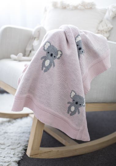 A gorgeous 100% cotton knit baby blanket featuring a soft little koala.
